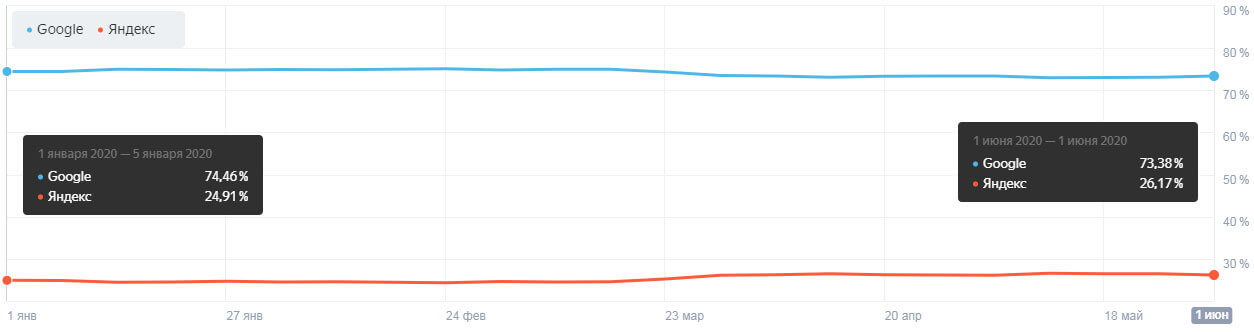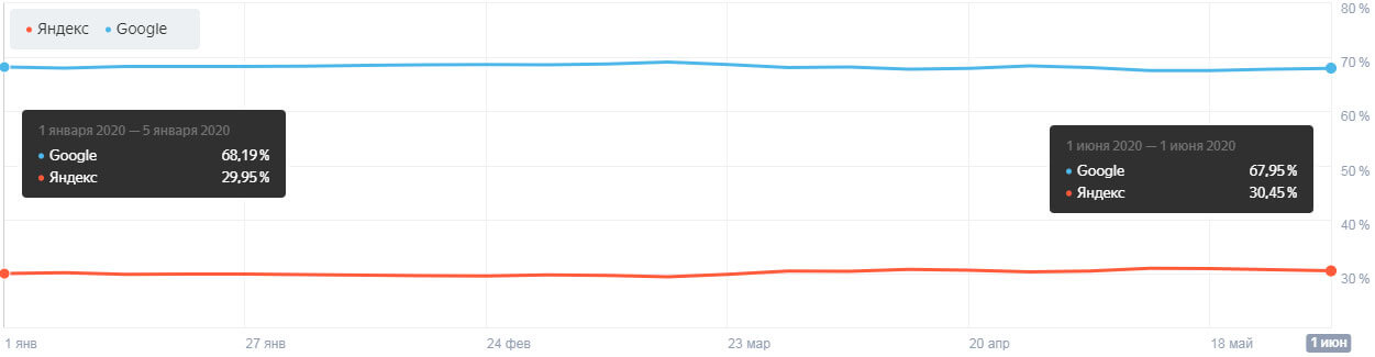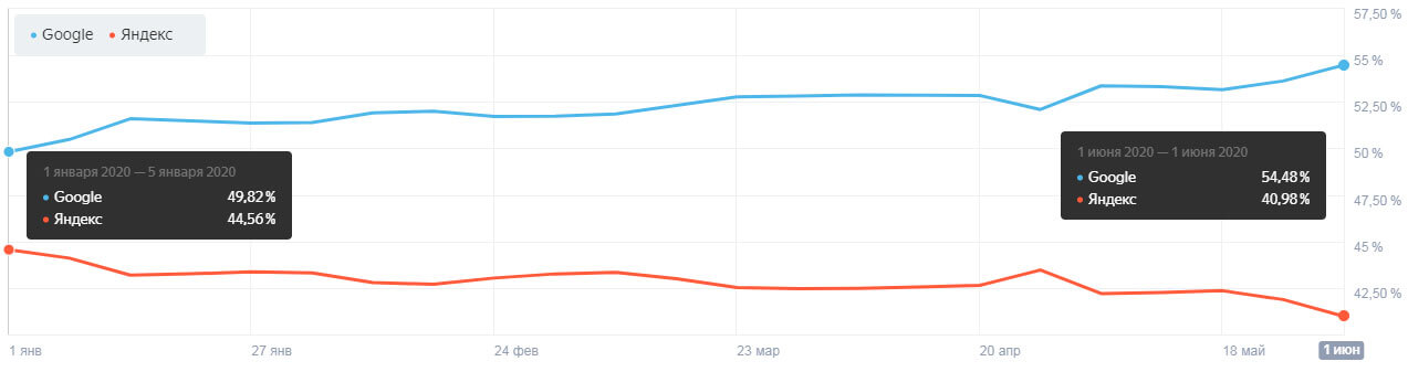 Среди пользователей компьютеров статистика следующая: по итогу года в Google зарегистрировано 54,48% визитов (прирост более 3%), в Яндекс 40,98 (меньше на 2%) в сравнении с концом 2019 года. Динамика роста — в пользу Google)