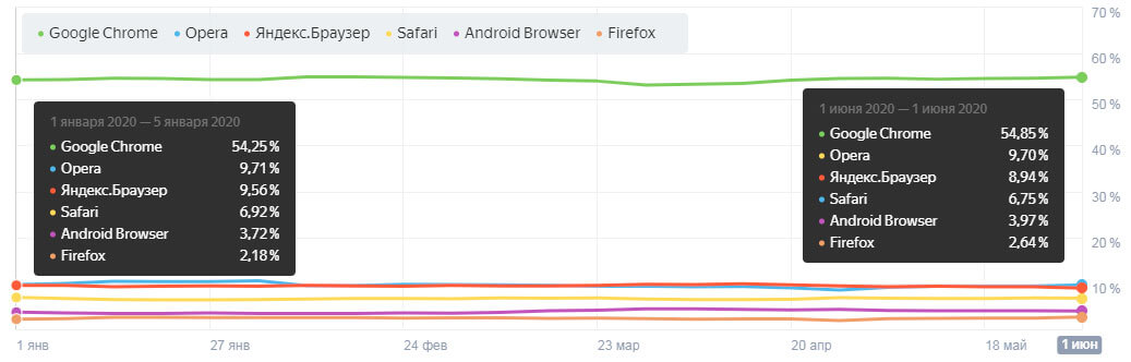 Пользователи Беларуси используют следующие браузеры (по итогам на 1 июня 2020):