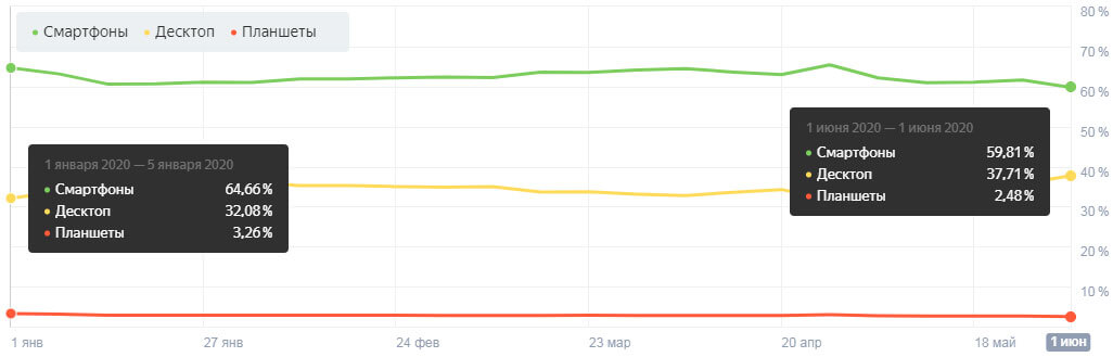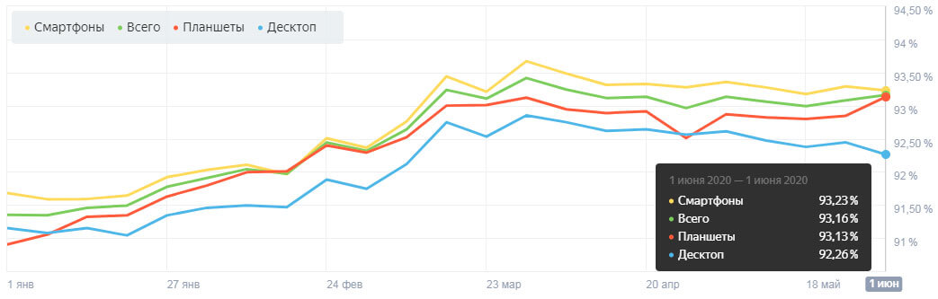 В сравнении с концом прошлого периода количество визитов со смартфонов уменьшилось на 1,38% чаще. Пользователи ПК увеличили посещаемость поисковиков на 1,74%.