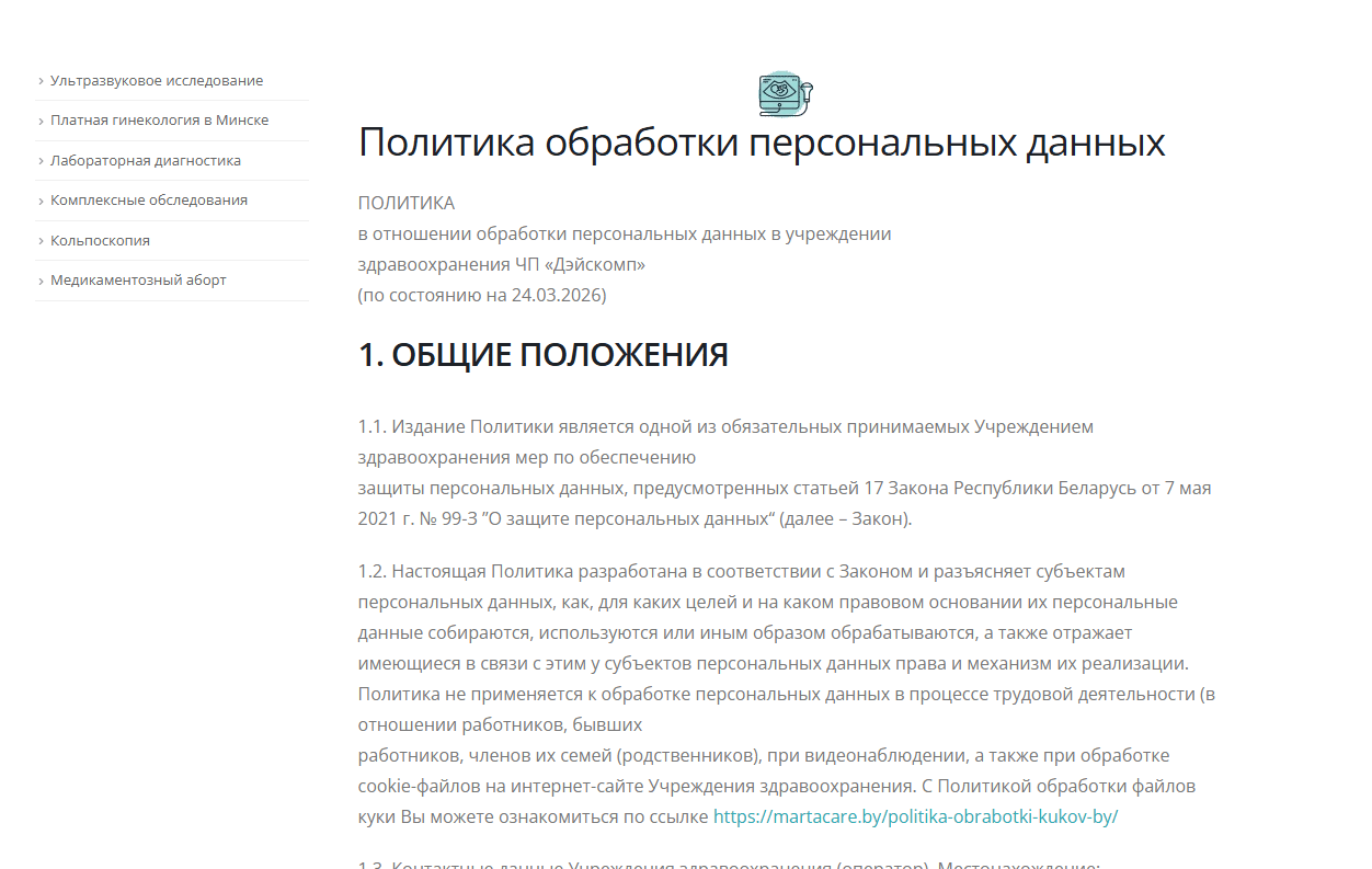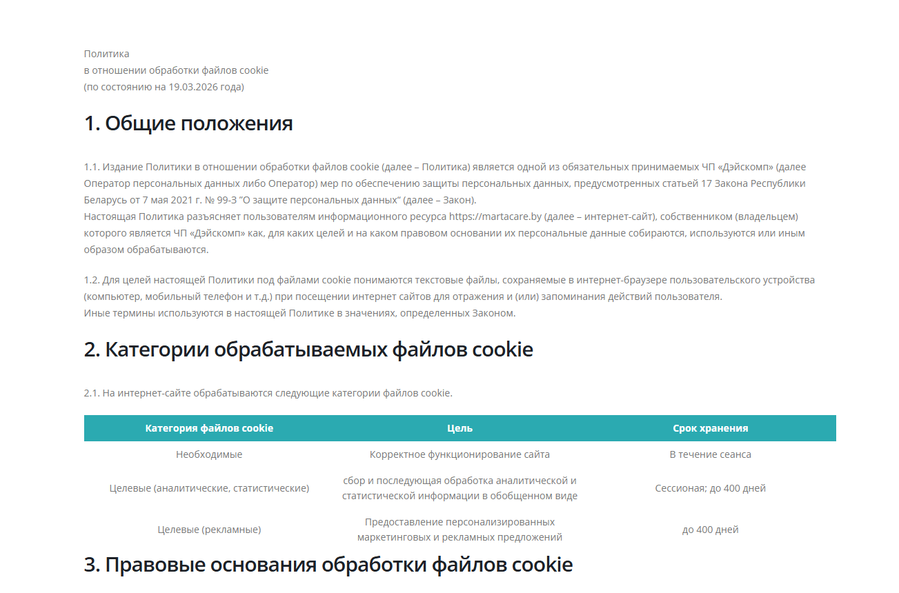 Для сайта martacare.by была реализована система информирования и управления согласием пользователей на использование файлов cookie. Это обязательное требование для современных веб-ресурсов, направленное на защиту персональных данных и прозрачность взаимодействия с посетителями.