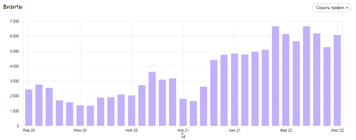 - Процент прироста посещаемости относительно июля 2020 года: 2021 — 320%, 2022 — 442%