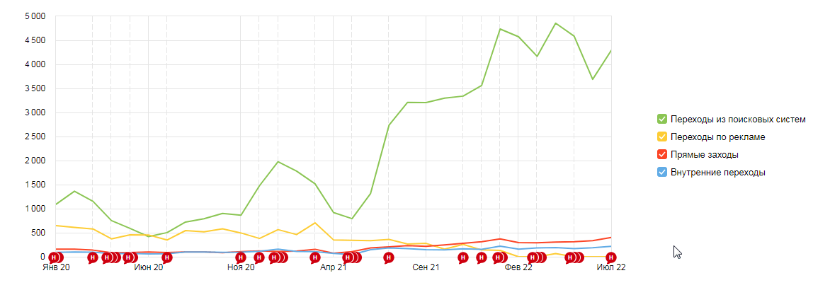 Ниже можно посмотреть два графика. Первый — это совокупный трафик из всех каналов (SEO, реклама, прямые переходы, переходы из соцсетей и другие источники). Второй график — это посещаемость сайта по самым популярным каналам.