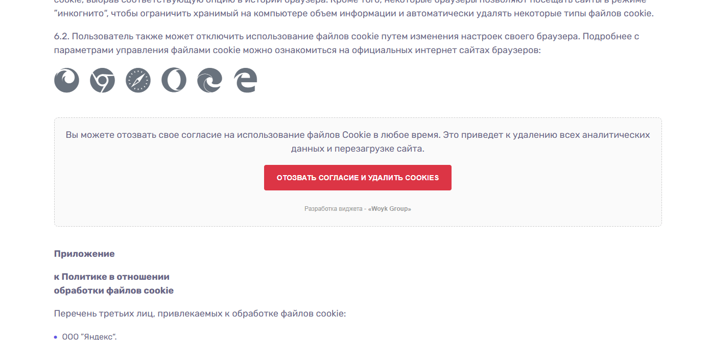В обязательном порядке создается новая страница — «Политика обработки файлов Cookies». На ней представлены две настройки — изменение типа файлов куки, которые разрешены на сайте и кнопка отзыва согласия поользователя.